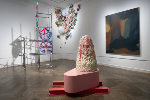 Künstler:innen des Kollektivs TBC führen durch die Ausstellung, geben Einblick in ihre Arbeitsweise und erläutern die Spuren ihres Nachbarschaftsaustausches. Ausgangspunkt ihres Zusammenschluss war der Wunsch nach einem solidarischen Austausch und gegenseitiger Unterstützung, was sich in der Ausstellung unter anderem in einem gemeinsam entwickelten Raumkonzept zeigt.
